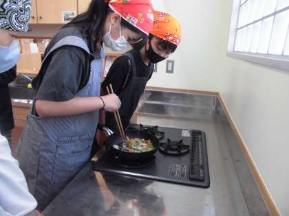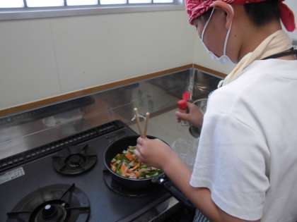 いろどりいための味付けは、カレー粉、ごま油、ラー油、鶏がらスープの素など、それぞれのグループで工夫しました。