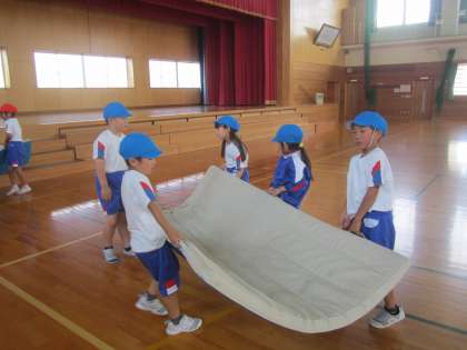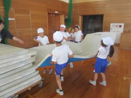 今日は、立ち幅跳びの測定をしたそうです。体育館をのぞいたときは、力を合わせてマットを片付けているところでした。