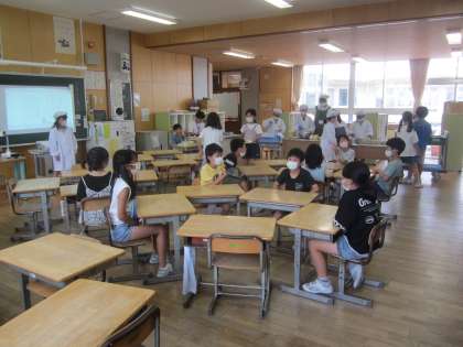 給食当番が手際よく盛り付けをしています。今日は、学校栄養職員の先生も、見守ってくださいました。