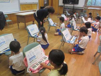 けんばんハーモニカを使って、せんりつあそびに取り組んでいます。「ぷっかりくじら」の一節を、オリジナルの旋律にして楽しみました。