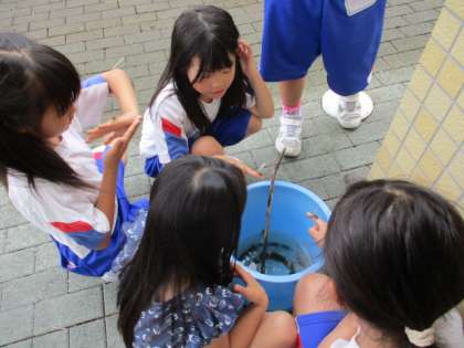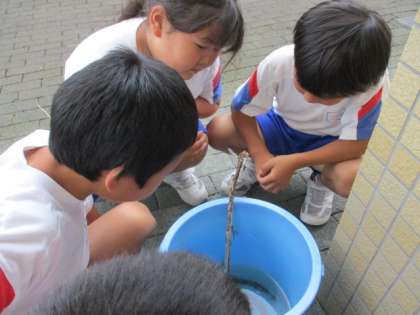 プールにいた(プール清掃で発見された)トンボの幼虫「ヤゴ」。バケツに入れて様子を見ていました。「水中ではトンボになれないから、這い上がれる枝か棒が必要だよ」と、調べたことを実践したら、あっという間に成虫(トンボ)になりました!羽化したばかりのトンボの様子を見守っている子供たちです。