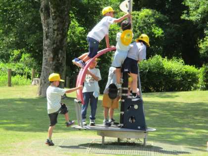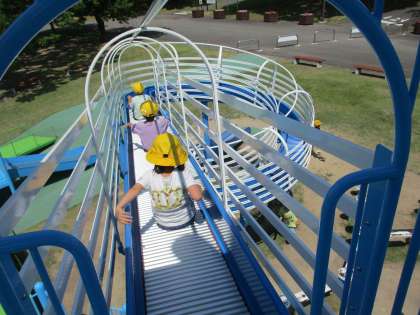 午後は、1年生だけで水辺のひろばへ行って 遊具で遊びました。大きな遊具でいろいろな遊びができて、おもしろかったです。