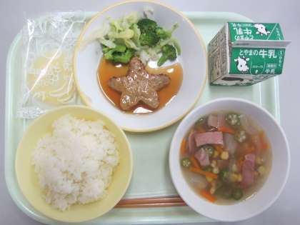 今日は、「七夕献立」でした。野菜スープに入っている、コーン、にんじん、オクラが彩りよく、味はもちろん見た目も楽しい献立でした。