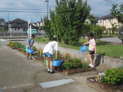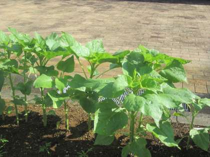 おはようございます。気温が高い日が続いています。花壇のヒマワリがぐんと大きくなりました。