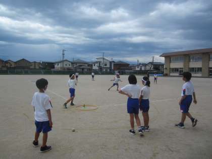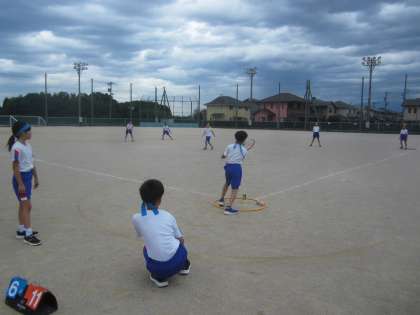 ラケットベースボールも終盤戦です。コースをねらって打ったりバントをしたり、攻撃も多彩です。守るチームも「1塁に投げるよ」「ドンマイ」など、気持ちのよい声が響いていました。
