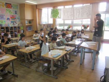 書き順、点や画の名前、画の付き方と交わり方など、1学期に学習したことを復習しました。その後、姿勢に気を付けて実際に課題文を書いてみました。