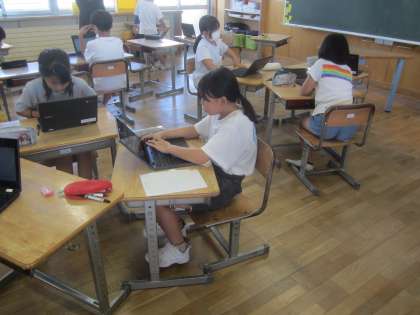 学級のよいところを伝える新聞をグループの友達と協力してつくっています。担当した記事の編集に取りかかっています。