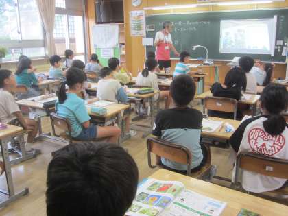 植物の成長について復習しています。「どうして実ができるのかな」など、新しい疑問が生まれて、予想したことを話し合っていました。