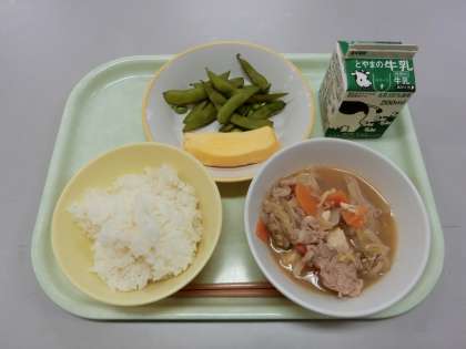 今日は旬の枝豆を塩茹でしました。すきやきは、ごま油と一味唐辛子を入れて韓国風に仕上げました。おいしくいただきました。