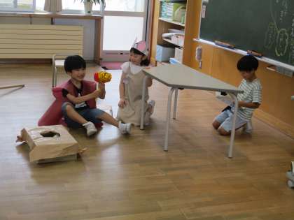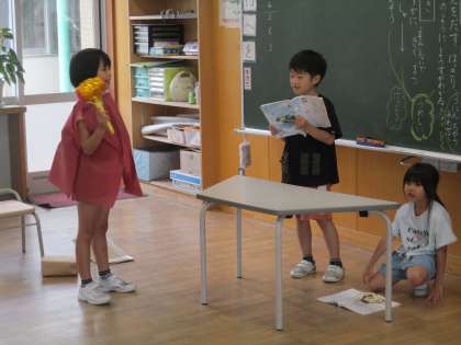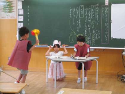 国語科で おむすびころりんの音読発表会をしました。声の大きさやリズムに気をつけて、役になりきって音読しました。振り付けを考えて、動きながら音読をしているグループもあって、楽しい発表会になりました。