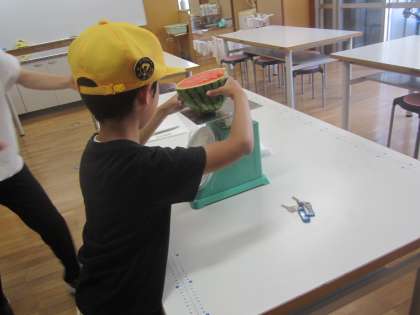 しらゆき級では、畑で育てたスイカを収穫しました。スイカの重さを量ろうとしましたが、用意した秤では足りないことが分かり、スイカを切って半分ずつ測定することにしました。