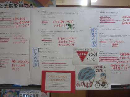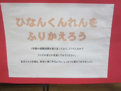 1学期の避難訓練の振り返りは、クイズに答える形で行いました。児童玄関に答えが掲示されています。夏休みを前に、交通安全のルールを確認する問題も出されています。