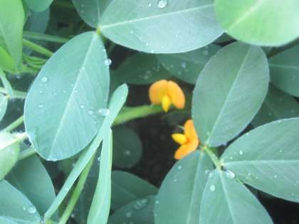 葉っぱにかくれるように咲いている小さな花を見つけました。落花生の花です。実を付けるのが楽しみです。