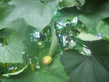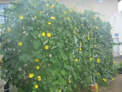 4年生のヘチマがぐんぐんつるを伸ばし、花をたくさん咲かせています。小さなヘチマの実もできはじめています。