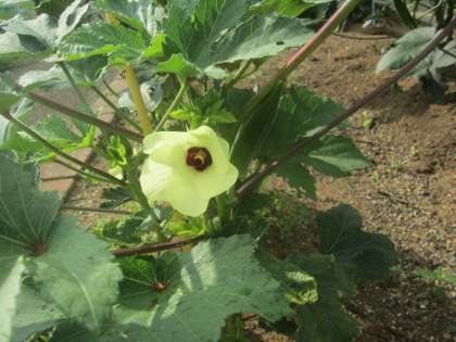 2年生が育てているオクラが花を咲かせています。この後も実ができそうですね。