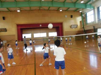 体育でソフトバレーボールをしました。相手のコートにボールを返せるよう練習しています。