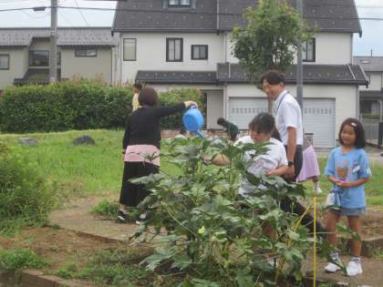 今にも雨が降りそうな曇り空のスタートです。2年生の畑では、オクラの実がなり続けています。