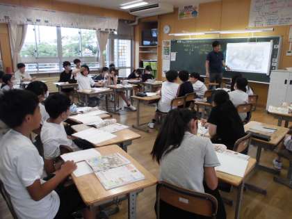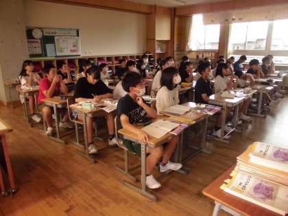 1組と2組の担任が入れ替わって交換授業を行っています。1組は社会、2組は理科の学習に落ち着いて取り組んでいました。