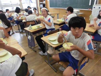 5年生はもりもり給食を食べています。調理員さんに感謝しながら、友達と楽しい時間を過ごしました。