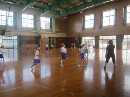 続いて、先頭の人をまねて動きました。スキップ、ジャンプ、かに歩きなど、いろいろな動きを考えていました。