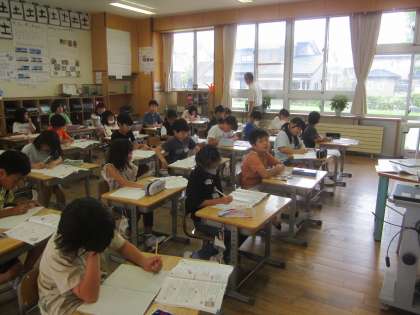3年生は、あまりのあるわり算に取り組んでいます。真剣に練習問題に取り組んでいるところです。たしかめの計算の仕方も学習しました。