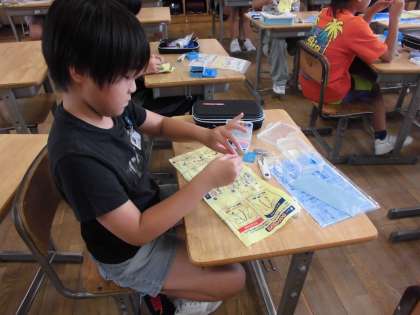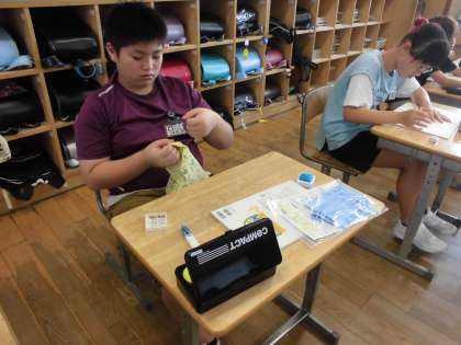 1学期のおさらいで、裁縫でボタン付けをしました。難しかったですが、最後までがんばりました。