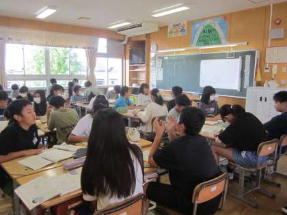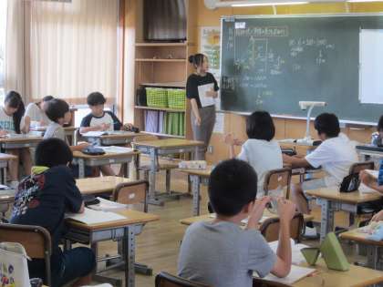 6年生は、どちらのクラスも算数の学習中でした。「拡大図と縮図」の学習です。直接には長さを測れない建物等の高さを求める方法を考えました。