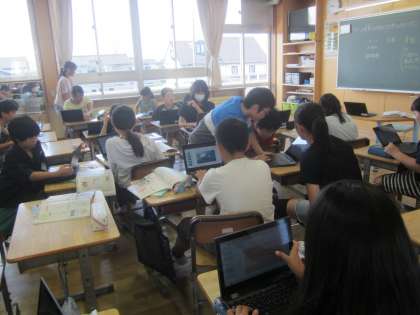 前の時間に続いて、水産業について学んでいます。学習課題についての自分の考えをまとめるために、資料集をつかったり、図書室の本を手がかりにしたりしています。スプレッドシートにまとめることで、友達の考えにも学ぶことができます。