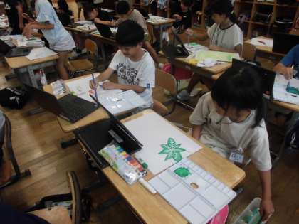 お気に入りの葉を水彩で描きました。緑にも、いろいろな濃さや色合いがあることを意識して、子供たちは好きな葉を描きました。