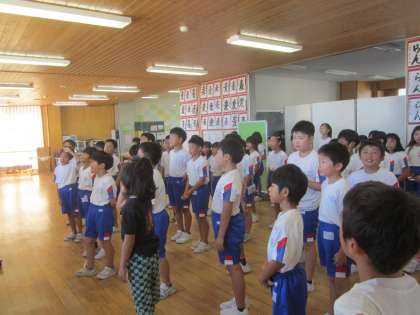 4年生学年朝の会の様子です。伸びのある歌声で今月の歌を歌っていました。