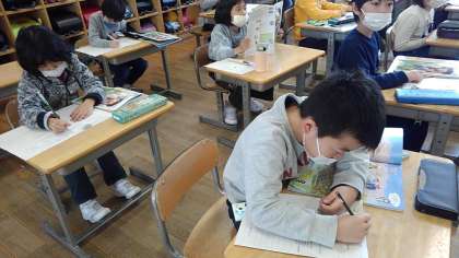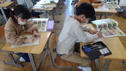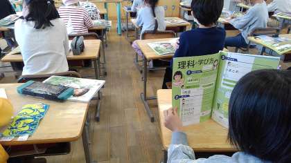 初めての理科の学習に興味津々です。外に出て、生き物や植物を観察しました。