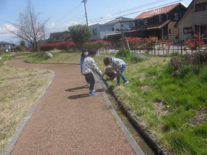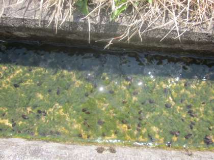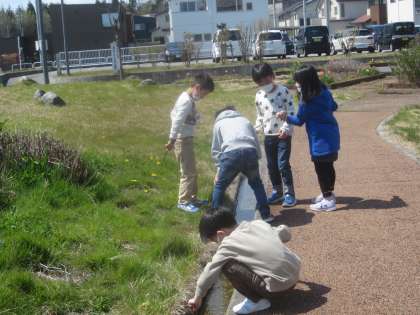 ビオトープから流れ出る小川の周りで遊ぶ子供たちの姿です。生き物と楽しく関わっています。中をのぞくと、貝たちが食事中でした。大広田は、貝も元気な学校です。