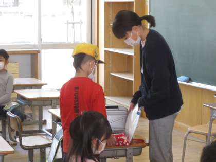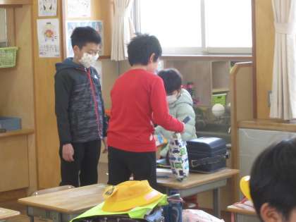 6年生は、1年生教室へ行き、朝の準備のお手伝いをしています。優しく声をかけたり、一緒に片付けたりしている姿が、頼もしく感じます。