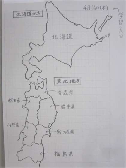 学習予定にのっている社会科の地図のかき方の例です。形をよく見て、丁寧にかきましょう。次の日からの地図をかく課題でも、同じようにかきましょう。