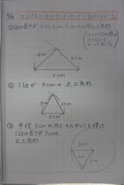 コンパスと物さしを使って三角形をかこう。(写真を参考にしてね。)