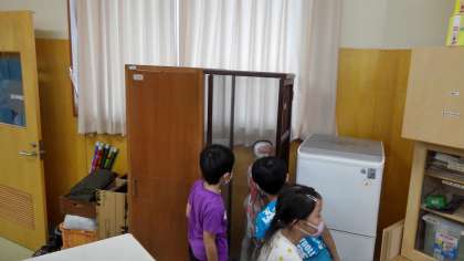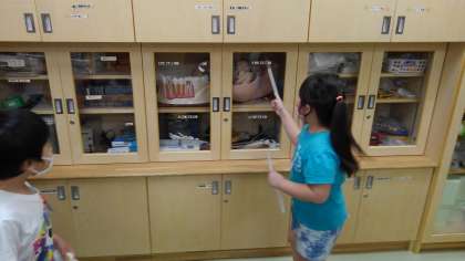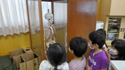 学校探検でいろいろな教室を見て回っています。理科準備室にあった、骸骨に驚いていました。
