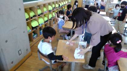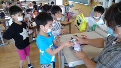 今日から9日まで、お弁当での給食です。コロナ感染予防の他に、食中毒への配慮として、全校児童の弁当を冷房の効いた会議室に保管したり、消毒を徹底したりして、取り組んでいます。