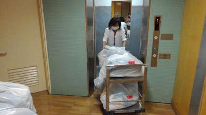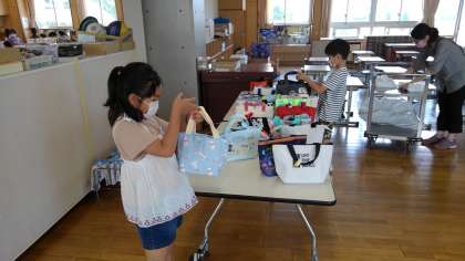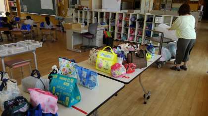 お弁当の時間5分前に、担任以外の教職員でお弁当を会議室から各教室に運びます。