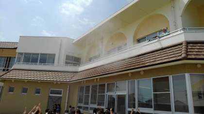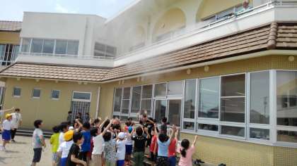 用務員さんからのサプライズ。ミストで体を冷やしています。