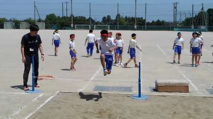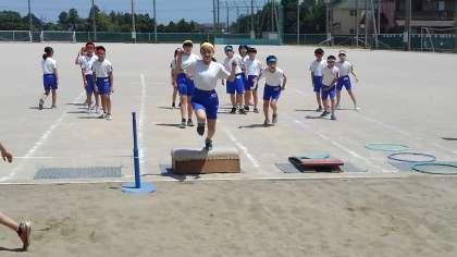 走り幅跳びの学習では、跳び箱やゴム、フラーフープを使った練習の場で一生懸命練習しました。記録も測り、技セブンのバッジにスターシールを貼りました。