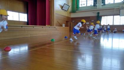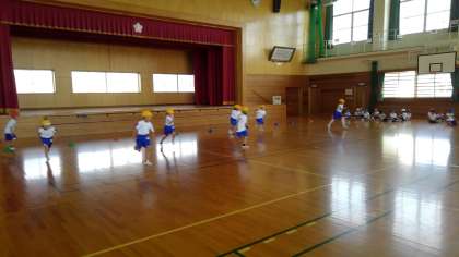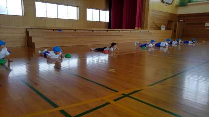 体ほぐしの運動に取り組んでいます。腹ばいからのダッシュでは、素早く起きて走っています。