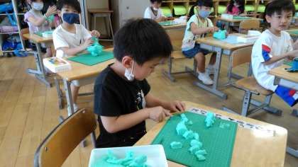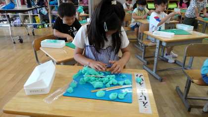 粘土を長く伸ばして、いろいろなものを作ったり、どれだけ長くできるか競ったりしました。