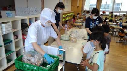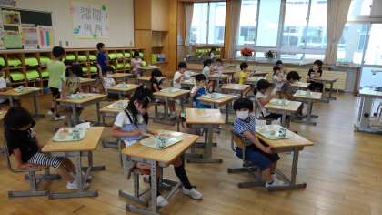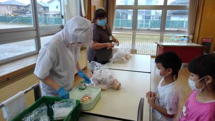 1、2年生の配膳は調理員さんや教職員が手伝っています。
