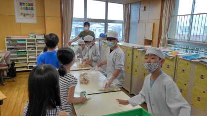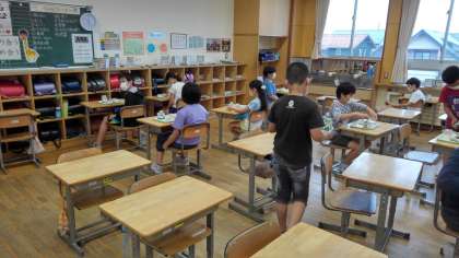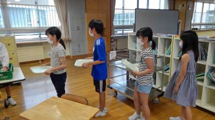 3年生以上は給食当番が間隔を空けて配膳しています。並ぶ際も、間隔に気を付け、配膳後は静かに席に座って待っています。