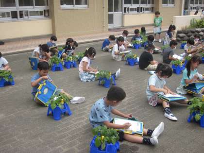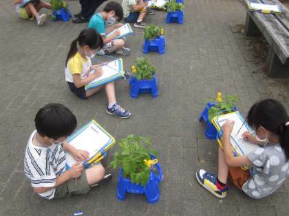 気温も高くなり、どんどん育っているあさがおの観察を行いました。大きくてたくさん生えてきた葉っぱの特徴や様子を観察カードにまとめました。、