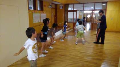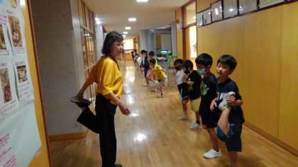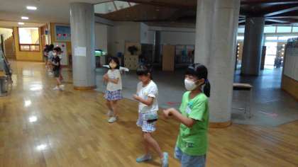 今日は雨が降っているので、大広体操を行いました。