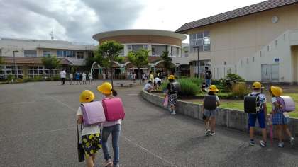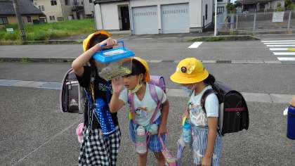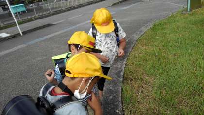 バッタやカナヘビ等、捕まえた生き物を自慢げに見せてくれる子供たちです。また、アリの行列を見つけて、のぞき込む子供たちです。