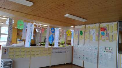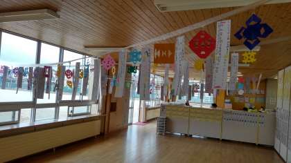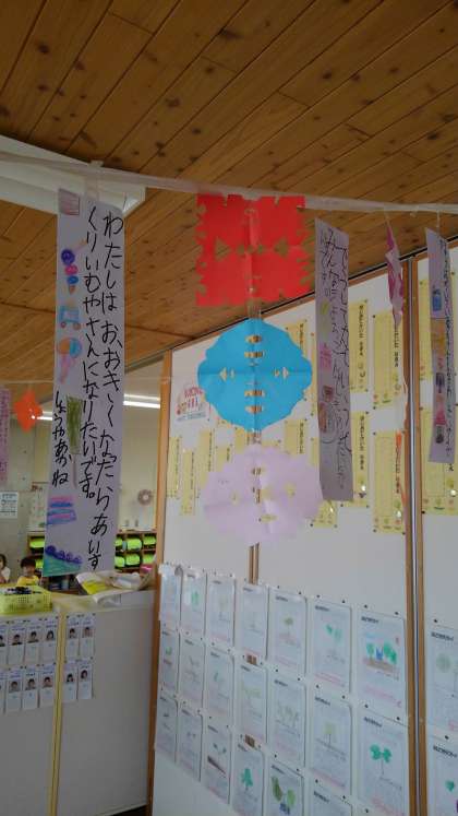 1年生廊下に七夕飾りが登場しました。いろいろな願い事が書かれた短冊や図画工作科で作った飾りがつけられています。