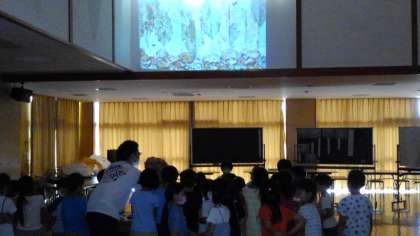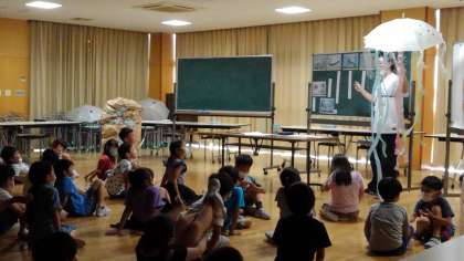 「スイミー」の学習では、ランチルームが暗い海の底の様になりました。クラゲや海草が漂っています。