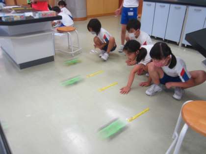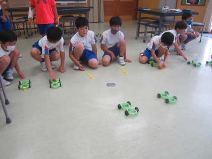 「風やゴムで動かそう」の学習をしています。ゴムの力の大小を調節して、どのように車が動くか実験しています。